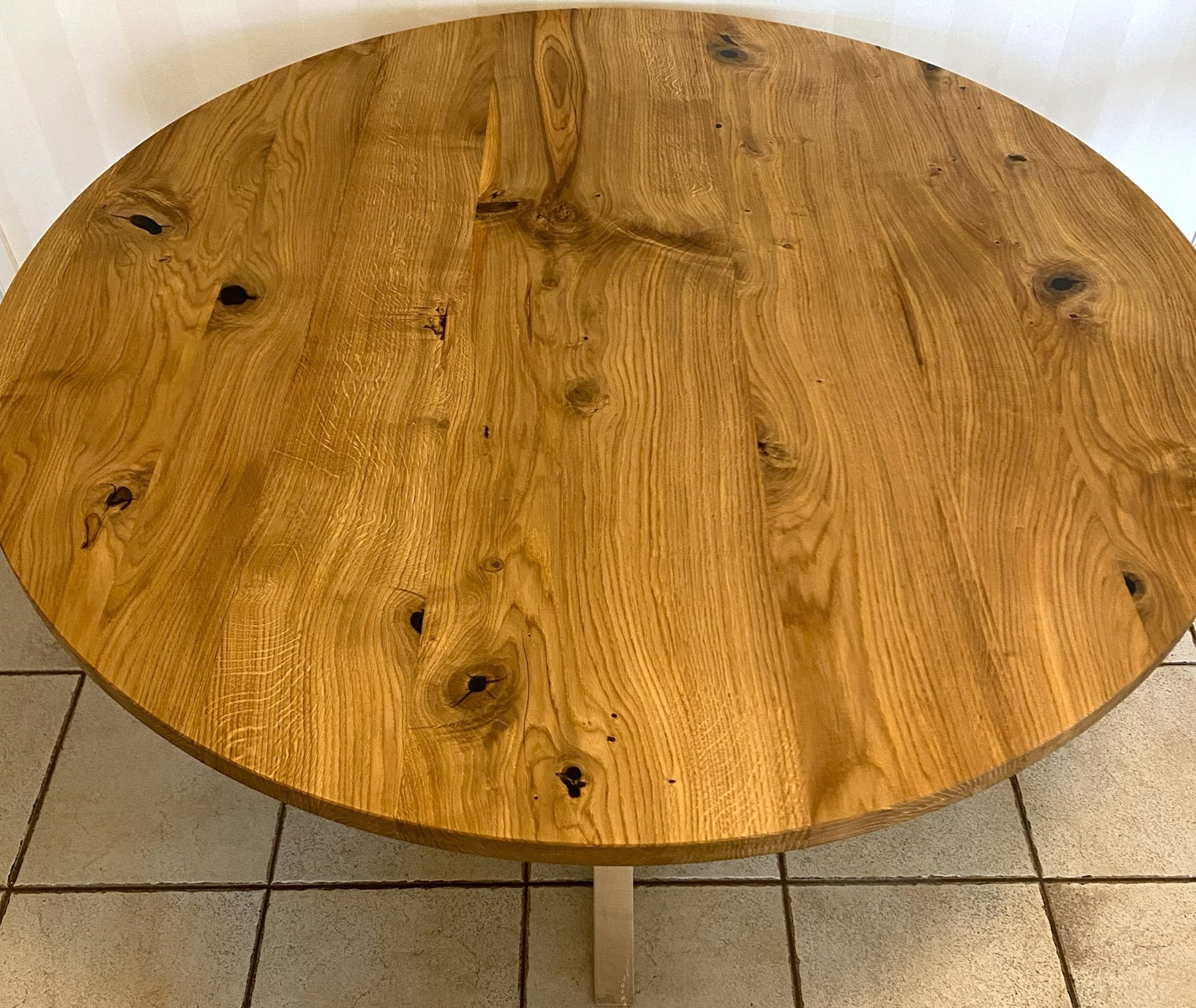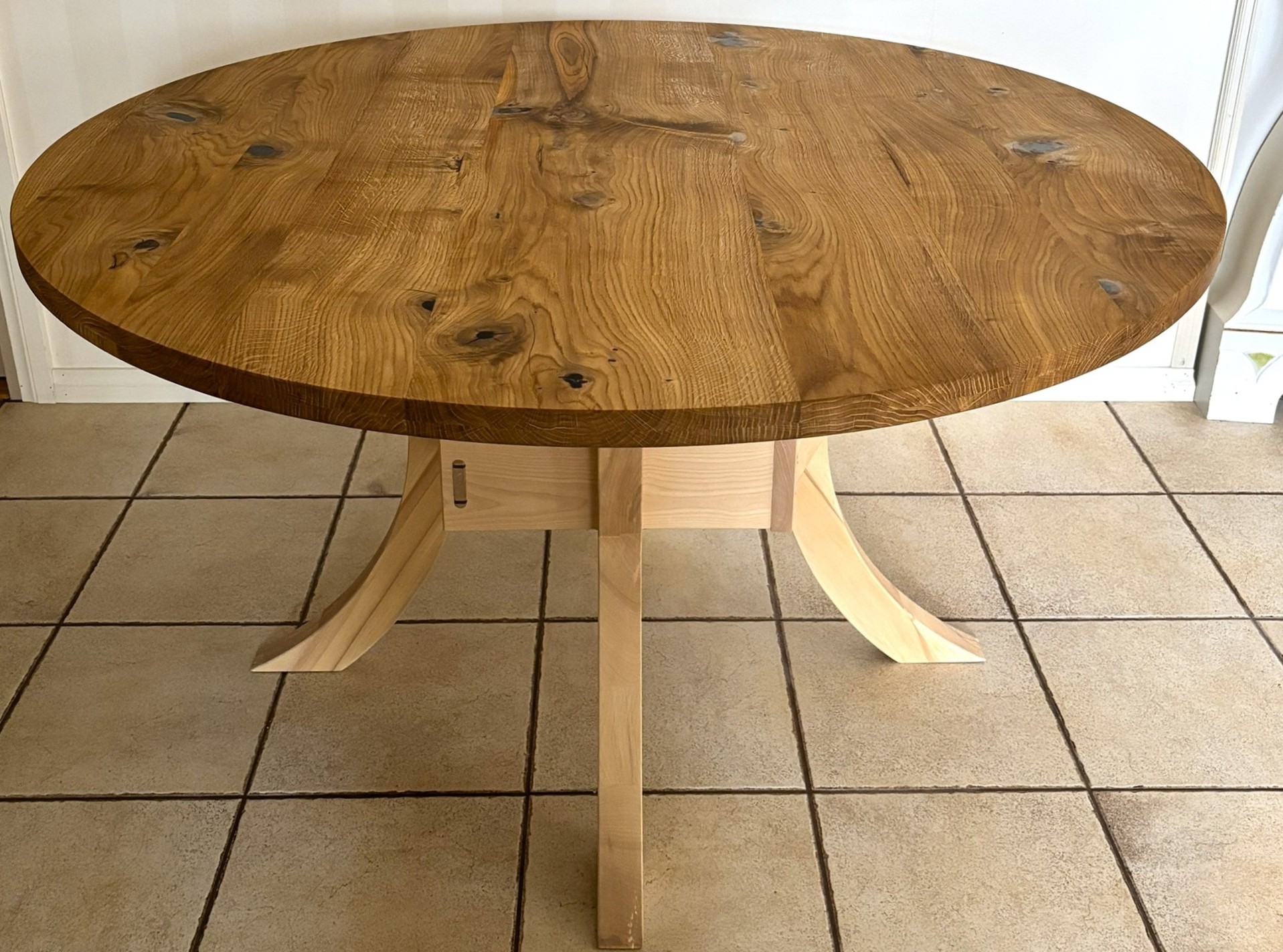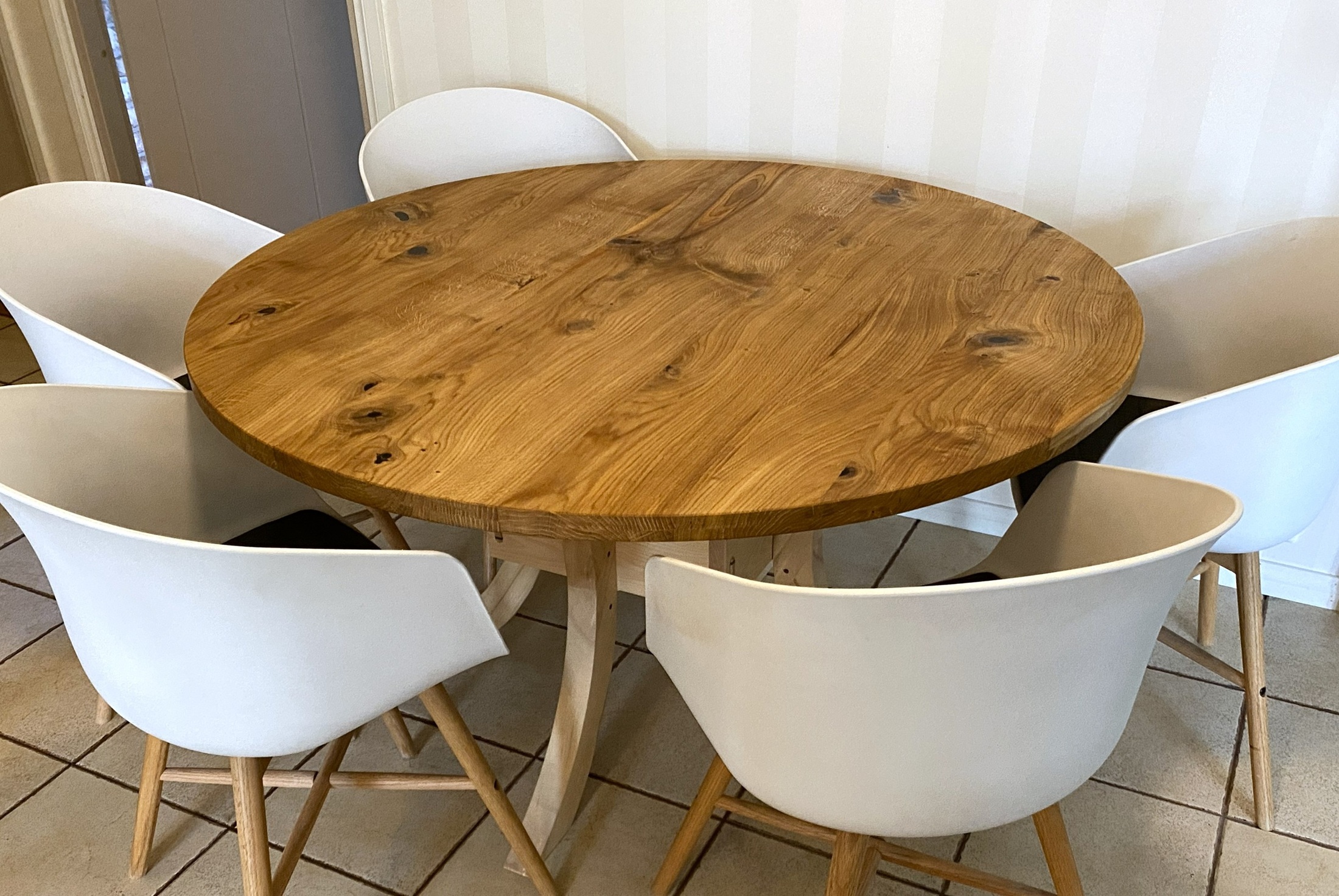 Tämä 90 cm halkaisijaltaan oleva pyöreä pöytä on tehty itse kaadetuista koivusta asiakkaan mittojen mukaan. Kansi on pulteilla kiinnitetty jalkojen päällä olevaan runkoon. Jalat on kiinnitetty liukuvalla v-uraliitoksella keskellä olevaan pöydän ”sydämeen”. Pöydän jalat jättävät istujalle hyvin tilaa ympäri pöydän. Koivu on kovaa puuta joten se soveltuu hyvin materiaaliksi jos haluaa pöydän, joka kestää naarmuja sekä…